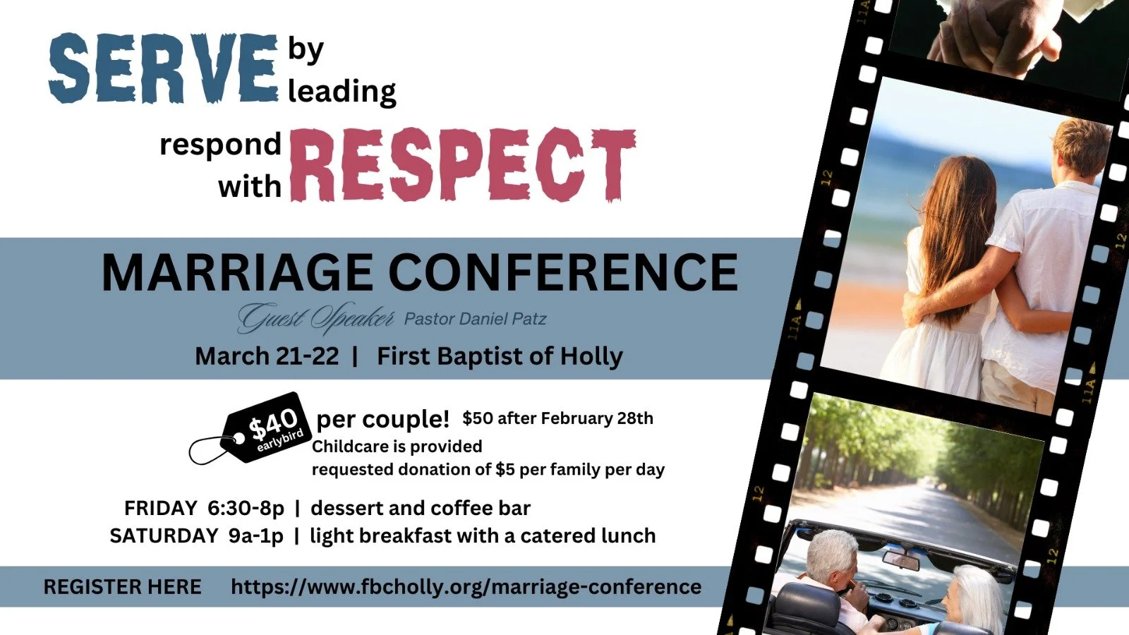 Our 2025 marriage conference at First Baptist Church of Holly will give you the opportunity to strengthen your marriage by learning more about God’s plan for marriage.